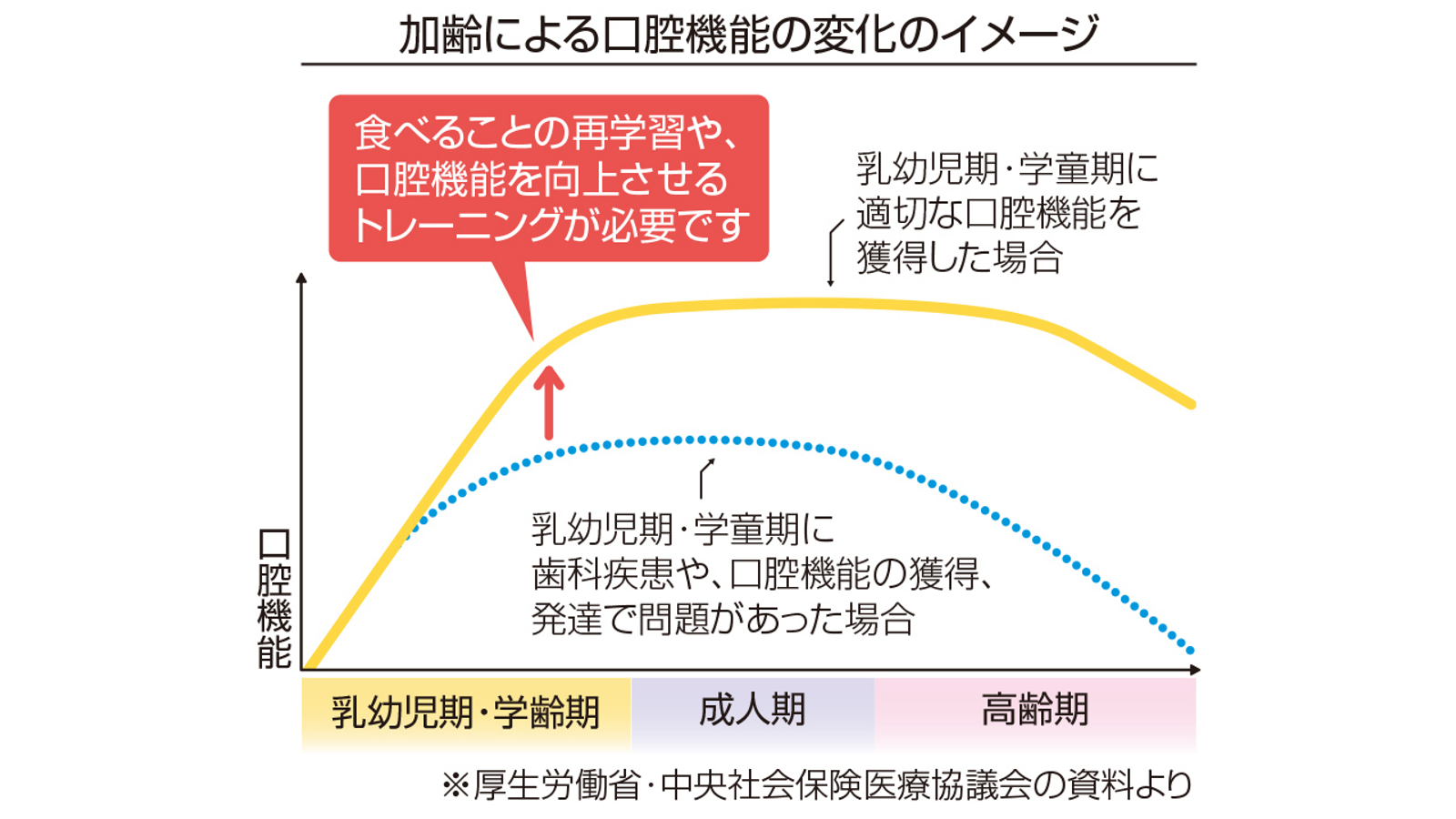 そもそも口腔機能はある日突然獲得されるものではなく、胎生期、乳幼児、幼少期から除去に獲得されていきます。そのため、口腔機能の発達が何らかの要因によって生理的に獲得されない場合、成人期では未成熟な機能であっても代償機能によって身体は適応し問題なく生活を営むことになりますが、その代償による結果は老年期に影響をきたし、正常な機能を獲得した場合と比してよりシビアな状態になり、口腔領域では被せ物の脱離や歯の破折、口腔機能リテラシーの低下による誤嚥、気道狭窄による睡眠障害、全身的には身体の各所のリハビリテーションに多大な量力が必要となっているのが現状ではないでしょうか。このようなことを踏まえ、小児と向き合う臨床に身を置いているものとして、幼少期に口腔機能を正常な状態まで発達させることがいかに大事であるかと痛感しています。